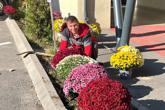 Este miez de toamnă, iar Florin şi-a umplut microbuzul cu crizanteme multicolore pe care, alături de Andreea, soţia sa, le plantează în rondoul de lângă UPU. Este un gest pe care-l face voluntar în amintirea mamei sale, decedată.