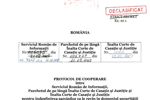 Documentul, semnat în anul 2009 între Serviciul Român de Informaţii, Parchetul de pe lângă Înalta Curte şi Înalta Curte de Casaţie şi Justiţie îi are ca semnatari pe George Maior, director SRI la acea vreme, Laura Codruţa Kovesi, procuror general, şi Nicolae Popa, preşedinte ÎCCJ. Din partea SRI, documentul are ca număr de înregistrare şi dată 21 august 2009, Parchetul General, tot 21 august 2009, iar Înalta Curte, 2 septembrie 2009.