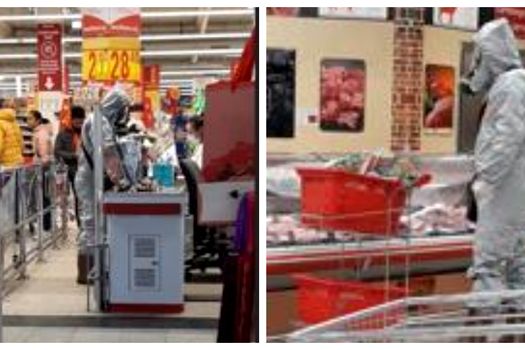 Teama provocată de coronavirus l-a făcut pe un braşovean să mearga la cumpărături purtând un costum „hazmat” – Hazardous materials suit. Acesta este destinat situaţiilor deosebit de periculoase şi este impermeabil.