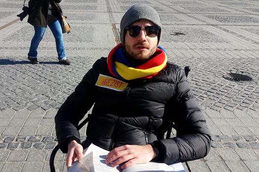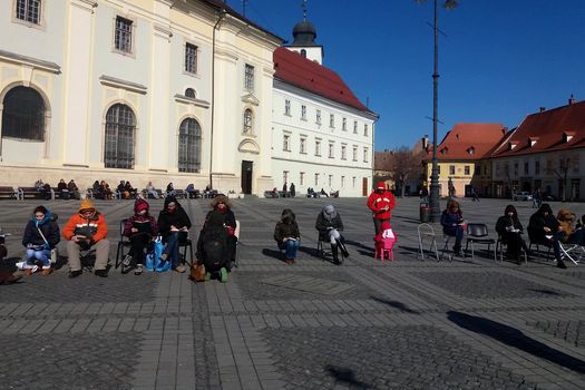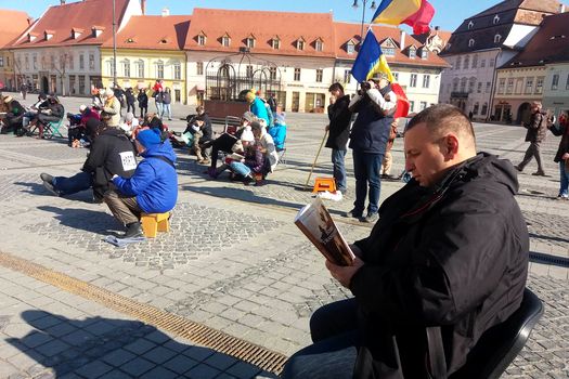 Sibienii s-au adunat în Piaţa Mare din centrul Sibiului cu scăunele şi cărţi, iar pe spătarul scaunului au afişat o coală A4 cu mesajul #REZIST. Oamenii nu au vorbit la telefon, nu au fumat şi nici nu au scandat, ci doar au citit.