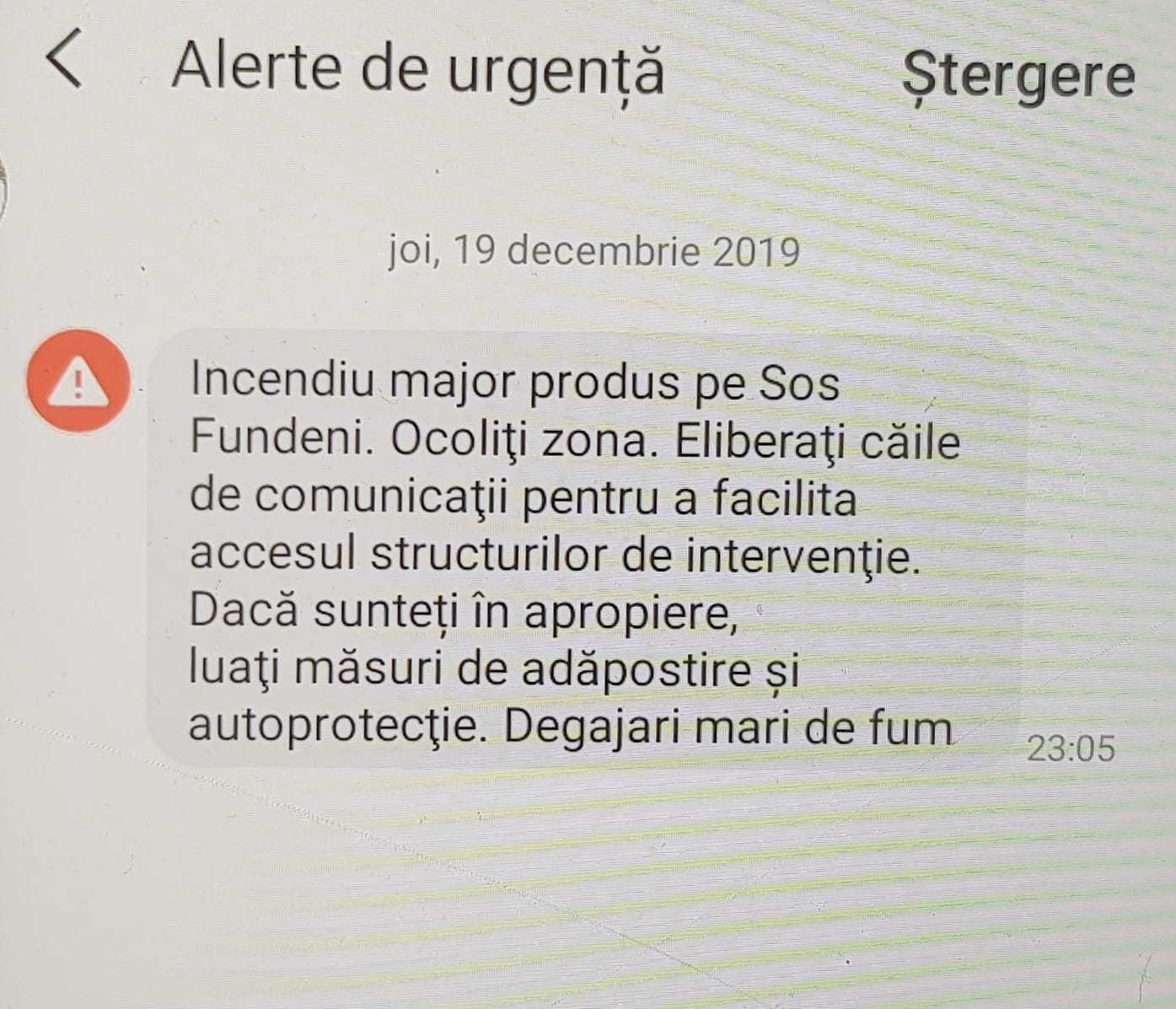 „Incendiu major produs pe Şoseaua Fundeni. Ocoliţi zona. Eiberaţi căile de comunicaţii pentru a facilita accesul structurilor de intervenţie. Dacă sunteţi în apropiere, luaţi măsuri de adăpostire şi autoprotecţie. Degajări mari de fum”, este mesajul pe care l-au primit bucureştenii prin sistemul RO-Alert.