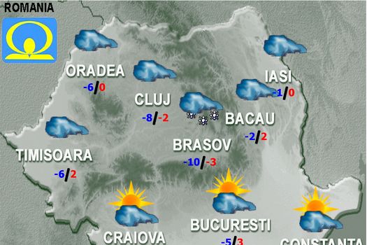 Cerul va fi temporar noros. Mai ales seara şi noaptea, pe arii restrânse, va ninge slab în zona montană, iar în Moldova, nordul Dobrogei şi posibil şi în nord-estul Munteniei, vor fi precipitaţii mai ales sub formă de ninsoare, ce vor putea favoriza depunerea de polei. Vântul va sufla slab şi moderat, cu unele intensificări la munte şi în regiunile estice. Temperaturile maxime, mai scăzute decât în mod normal la această dată în jumătatea de nord a ţării, dar şi în zonele deluroase din rest, vor fi cuprinse între -6 grade în estul Transilvaniei şi 7 grade în vestul Olteniei. Temperaturile minime vor fi mai mici decât mediile multianuale în cea mai mare parte a ţării şi vor avea valori cuprinse, în general, între -11 şi -1 grad. Dimineaţa şi noaptea, în zonele joase de relief, izolat, va fi ceaţă asociată cu chiciură.