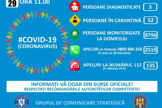 În acest moment, la nivel naţional, sunt 52 persoane în carantină şi 8.796 persoane în izolare la domiciliu.