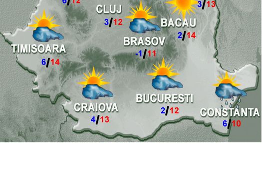 Vor fi înnorări şi izolat condiţii de ploi slabe trecătoare, în vestul şi nord-vestul ţării, iar în prima parte a zilei şi în sud-est, în timp ce în restul teritoriului cerul va fi variabil la parţial noros. Vântul va sufla slab şi moderat, cu unele intensificări, în special în a doua parte a intervalului, la munte şi în Banat. Temperaturile maxime se vor încadra între 8 şi 16 grade, iar cele minime între 0 şi 9 grade, mai scăzute în depresiunile din estul Transilvaniei, spre -4 grade. Spre dimineaţă, în zonele joase de relief vor fi condiţii de ceaţă.