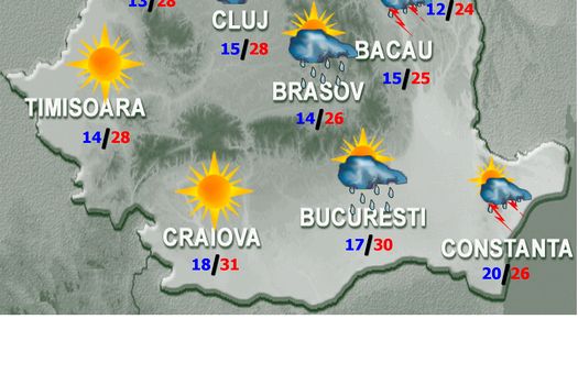 Cerul va fi variabil, cu înnorări temporare în regiunile sudice, estice şi centrale, unde pe arii restrânse vor mai fi averse şi descărcări electrice. Vântul va sufla slab şi moderat, cu intensificări în Moldova, Dobrogea, Bărăgan, la munte şi pe spaţii mici în celelalte regiuni.