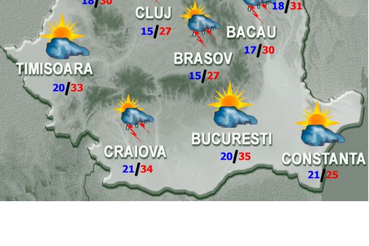 Temperaturile maxime se vor încadra între 25 şi 35 de grade, mai ridicate în Lunca Dunării, până în jurul a 37 de grade, iar cele minime între 12 şi 22 de grade. În jumătatea de nord a ţării, la deal şi la munte, vor fi înnorări temporar accentuate şi, mai ales după-amiaza şi seara, vor fi averse şi cu caracter torenţial, frecvente descărcări electrice şi intensificări de scurtă durată ale vântului care vor lua şi aspect de vijelie. Pe arii restrânse, cantităţile de apă vor depăşi 20 l/mp şi izolat 35-45 l/mp şi va cădea grindină. În celelalte zone, cerul va fi variabil, iar astfel de fenomene se vor semnala pe spaţii mai mici.