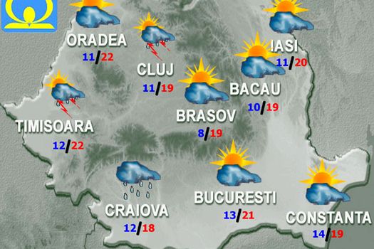 Temperaturile maxime se vor încadra între 16 şi 22 de grade, iar cele minime între 4 şi 14 grade.