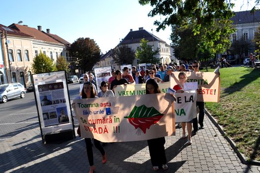 La Bistriţa, peste 60 de persoane s-au adunat în parcul de lângă Biserica Evanghelică din centrul oraşului, scandând „Uniţi salvăm Roşia Montană”.