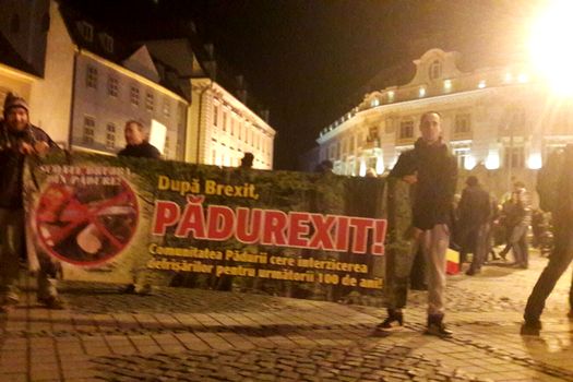 Aproximativ 500 de sibieni au ieşit, duminică seara, în Piaţa Mare din Sibiu, la protest împotriva Guvernului şi împotriva tăierilor ilegale ale pădurilor, oamenii purtând un banner pe care scrie „După Brexit, Pădurexit”, transmite corespondentul MEDIAFAX.