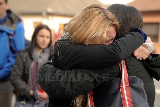 Nepoata bătrânei, Crina Coliban, plânge în timp ce este îmbrăţişată pe rând de prieteni şi chiar de oameni obişnuiţi care au venit să îi fie alături.