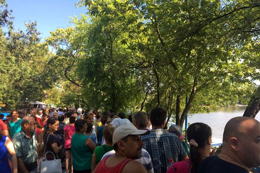 Pe uscat sunt, în tot acest timp, sute de oameni care aşteaptă, aliniaţi în grupuri de câte doi, să poată pleca şi ei la o plimbare cu vaporaşul.
