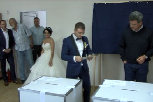 Tinerii însurăţei s-au prezentat la vot la o secţie din cartierul Alfla din municipiul Arad, iar când au intrat în secţia de votare au atras toate privirile pentru că tânărul era în costumul de mire, iar tânăra era îmbrăcată cu rochia de mireasă.