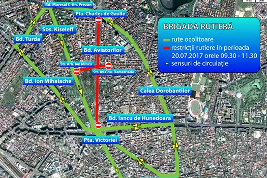 Astfel, joi, între 09:30 şi 11:30, vor fi impuse restricţii de circulaţie, pe Bd. Aviatorilor, pe ambele sensuri de circulaţie, între Piaţa Victoriei şi Piaţa Charles de Gaulle, Aleea Modrogan şi Aleea Alexandru, Str. Arhitect Ion Mincu, pe ambele sensuri de circulaţie, între Şos. Kiseleff şi Bd. Aviatorilor şi Str. Aviator Gheorghe Demetriade, pe ambele sensuri de circulaţie, între Str. Emil Pangratti şi Bd. Aviatorilor.