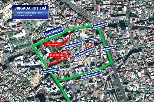 Traficul rutier va fi închis în data de 14 iulie, pe str. Christian Tell (între Piaţa Amzei şi bd. Dacia), începând cu ora 08:00, şi pe str. Biserica Amzei (între str. Mendeleev şi Calea Victoriei), începând cu ora 14:00 până la terminarea activităţilor, a anunţat Poliţia Română într-un comunicat de presă remis miercuri agenţiei MEDIAFAX.
