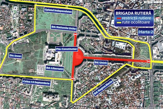 În perioada restricţiilor de trafic, şoferii pot circula pe rutele ocolitoare Calea 13 Septembrie – bd. Libertăţii – Piaţa George Coşbuc – bd. Regina Maria, strada Izvor – strada Haşdeu – Splaiul Independenţei, bd. Unirii – Piaţa Unirii – Splaiul Independenţei – strada Haşdeu – strada Izvor – Calea 13 Septembrie.