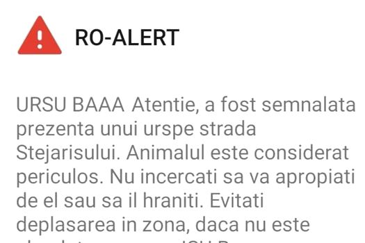 „URSU BĂĂĂ. Atenţie, a fost semnalată prezenţa unui urs pe strada Stejărişului. Animalul este considerat periculos. Nu încercaţi să vă apropiaţi de el sau să îl hrăniţi. Evitaţi deplasarea în zonă, dacă nu este absolut necesară” – a fost mesajul RoAlert transmis.