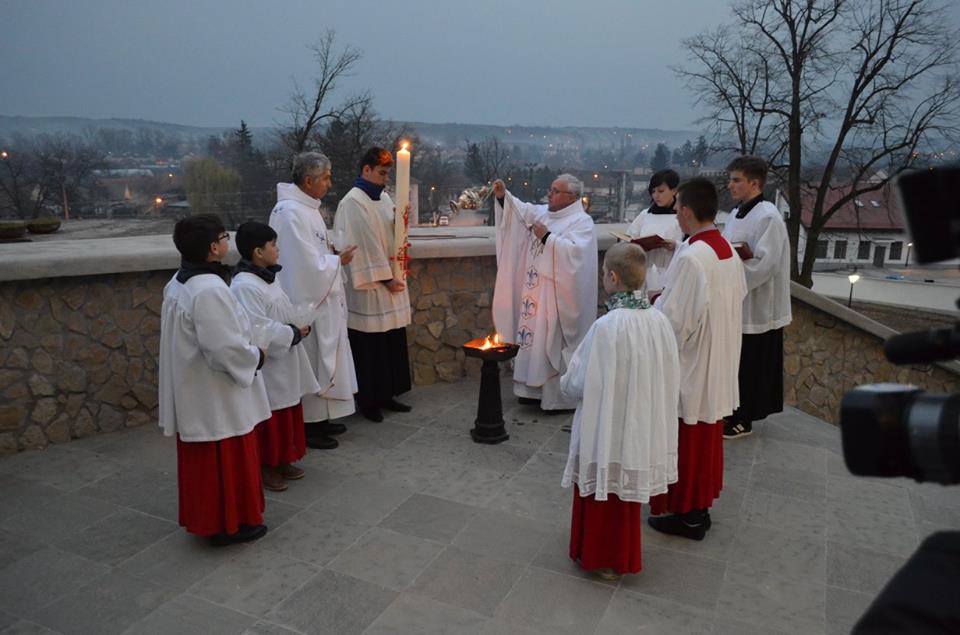 Sute de credincioşi romano-catolici de etnie maghiară din Cluj-Napoca au participat, sâmbătă seara, la slujba de sfinţire a focului care a avut loc în faţa Bisericii „Sf. Mihail” din centrul municipiului, de unde au luat lumină. Aceştia s-au adunat, sâmbătă seara, în jurul orei 20, în faţa lăcaşului de cult, unde mai mulţi preoţi au aprins un foc, de la care s-a împărţit lumina, după care toţi cei prezenţi au intrat în biserică, pentru a asista la slujba de Înviere oficiată de preotul paroh Kovacs Sandor. La finalul slujbei, credincioşii au ieşit cu lumânări aprinse în mâini şi au înconjurat, o singură dată, într-o procesiune, biserica.