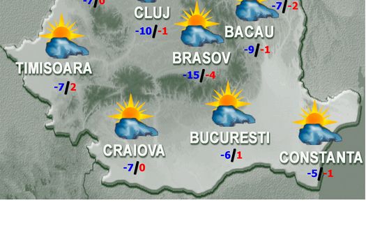Cerul va fi variabil la senin, cu înnorări mai ales în prima parte a intervalului în regiunile sud-vestice, iar la începutul zilei şi în cele sudice, sud-estice şi la munte, unde izolat şi trecător va ninge slab. Noaptea, nebulozitatea se va accentua treptat în jumătatea de nord-est a teritoriului. Vântul va sufla slab şi moderat, cu unele intensificări în cursul zilei în sud-est. Temperaturile maxime vor fi cuprinse între -7 şi 4 grade, iar cele minime se vor încadra între -20 de grade în estul Transilvaniei şi -4 grade în Dealurile de Vest. Izolat, dimineaţa şi noaptea se va semnala ceaţă şi chiciură.