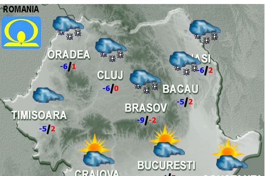 Temporar va ninge slab, local în zona montană şi în Moldova şi pe arii mai restrânse în Muntenia şi Dobrogea, unde trecător vor fi posibile precipitaţii mixte, favorizând producerea de polei. Vântul va sufla slab şi moderat, cu unele intensificări pe crestele montane, iar în a doua parte a intervalului, la cote mai reduse, în estul şi sud-estul teritoriului. Temperaturile maxime vor fi cuprinse între -3 grade în estul Transilvaniei şi 7 grade în Oltenia, iar cele minime se vor încadra, în general, între -10 şi -2 grade.