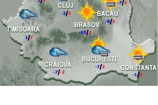 Cerul va fi variabil, cu înnorări temporar accentuate în vest şi nord-vest, unde pe arii restrânse, la începutul zilei şi din nou în cursul nopţii vor fi precipitaţii slabe mai ales sub formă de ploaie sau burniţă ce vor favoriza depunerile de polei şi precipitaţii mixte în regiunile montane aferente. În zonele joase de relief, în special în cele din sudul şi estul teritoriului, vor fi nebulozitate joasă, ceaţă cu depunere de chiciură şi trecător burniţă, favorizând apariţia poleiului. Vântul va sufla slab şi moderat, cu unele intensificări, mai ales în a doua parte a intervalului în Banat, Crişana şi pe crestele montane. Temperaturile maxime vor fi cuprinse între -5…-3 grade în zonele cu ceaţă persistentă şi 8…9 grade în Dealurile de Vest, iar cele minime se vor situa, în general, între -10 şi 2 grade.