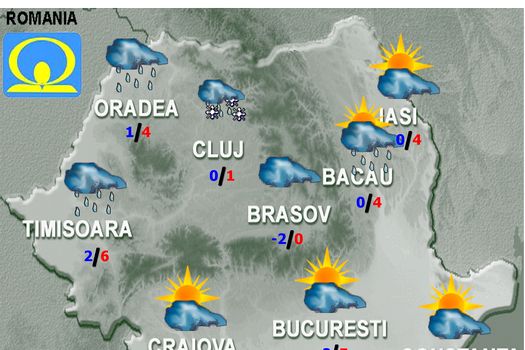 În regiunile din vestul, centrul şi nordul teritoriului, iar noaptea şi în est, cerul va fi mai mult noros. La munte, mai ales la altitudini mari, vor predomină ninsorile, iar în Maramureş, Transilvania, zona deluroasă din Banat şi Crişana şi local în Moldova se vor semnala precipitaţii mixte. În sud şi sud-est înnorările vor fi temporare şi doar izolat vor fi precipitaţii slabe, predominant ploi. Vor fi condiţii de polei. Vântul va avea intensificări, mai ales în zona montană înalta. Temperaturile maxime se vor încadra între -1 grad în estul Transilvaniei şi 7 grade în Banat şi Oltenia, iar cele minime vor fi cuprinse între -4 şi 3 grade.