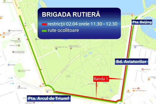 „În ziua de 02.04.2017, în intervalul 08:00 – 16:00 se va desfăşura un eveniment sportiv, pe următorul traseu: Parcul Herăstrău, intrarea Pescăruş – banda I de circulaţie de pe Bd. Aviatorilor, sensul către Piaţa Charles de Gaulle – Piaţa Charles de Gaulle – banda I de circulaţie pe Bd. Constantin Prezan, sensul către Arcul de Triumf, intrarea de la Arcul de Triumf în Parcul Herăstrău. Între orele 11.30 – 12.30, pentru buna desfăşurare a evenimentului, se va restricţiona traficul rutier pe Bd. Constantin Prezan, banda I de circulaţie între Piaţa Charles de Gaulle şi Piaţa Arcul de Triumf; Bd. Aviatorilor, banda I de circulaţie, între Piaţa Beijing (intrare Pescăruş) şi Piaţa Charles de Gaulle”, mai spun poliţiştii.