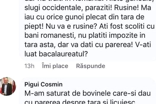 „Hai sictir, ălora care vă daţi cu părerea, dar nu trăiţi în România. Nişte gunoaie, slugi occidentale, paraziţi! Ruşine! Mă iau cu orice gunoi plecat din ţară de piept! Nu vă e ruşine? Aţi fost şcoliţi cu bani româneşti, nu plătiţi impozite în ţara asta, dar vă daţi cu părerea. V-aţi dat bacalaureatul? M-am săturat de bovinele care-şi dau cu părerea despre ţară şi locuiesc afară. Spălători de bude în occident. Nu mă umiliţi voi pe mine şi nici pe aleşii mei”, a scris Cosmin Pigui într-un mesaj pe Facebook.
