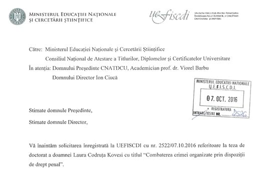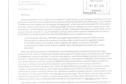 Cristian Dogaru, lector la o universitate din Anglia, a notificat oficial, vineri, Consiliul Naţional de Atestare a Titlurilor, Diplomelor şi Certificatelor Universitare (CNATDCU), pentru ca instituţia să verifice teza de doctorat a procurorului-şef DNA, Laura Codruţa Kovesi.