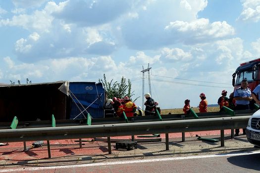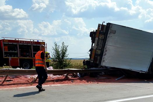 Accidentul în care au fost implicate un autocamion încărcat cu cereale şi un autoturism a avut loc în jurul orei 13.00 în zona localităţii Fundulea, judeţul Călăraşi. Autocamionul, care circula pe sensul către Capitală, s-a răsturnat peste parapetul care separă sensurile de mers şi s-a izbit de un alt autoturism care se deplasa regulamentar, două persoane fiind rănite.