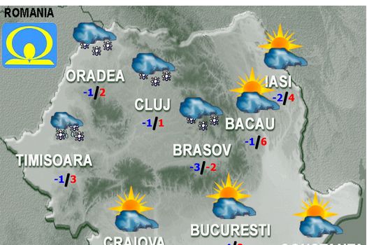 În vestul, nordul şi centrul ţării, înnorările vor persista şi vor mai cădea precipitaţii, sub formă de ninsoare, dar trecător şi lapoviţă şi ploaie, favorizând depuneri de polei. Astfel de manifestări, în condiţiile unui cer temporar noros, vor fi şi în restul teritoriului, dar pe arii mai restrânse, cu precădere în cursul zilei. Vântul va sufla moderat cu unele intensificări, îndeosebi în regiunile sud-vestice şi de răsărit, iar la munte, în special pe creste, va sufla tare, viscolind şi spulberând zăpada. Temperaturile maxime se vor încadra între -1 şi 8 grade, iar cele minime între -7 şi 2 grade.