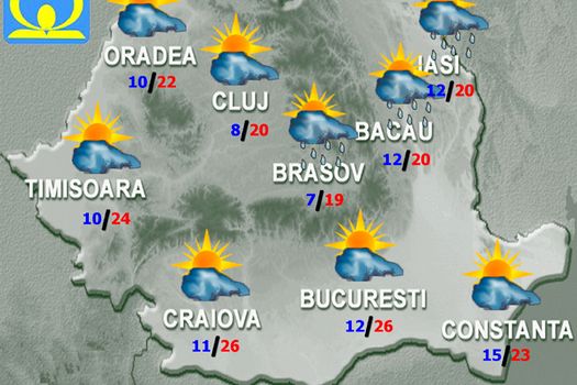 Temperaturile maxime vor fi cuprinse între 17 grade în nordul Moldovei şi în estul Transilvaniei şi 27 de grade în Lunca Dunării, iar cele minime între 6 şi 15 grade, mai coborâte în depresiuni spre 3 grade.