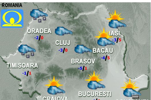 Vremea va fi rece, mai ales dimineaţa şi noaptea. Temperaturile maxime se vor încadra între -2 şi 6 grade, iar cele minime vor fi cuprinse între -10 grade în estul Transilvaniei şi 0 grade pe litoral. În regiunile intracarpatice vor fi înnorări şi local precipitaţii mixte ce vor favoriza pe spaţii restrânse depuneri de polei în Banat şi Crişana şi predominant ninsori în Transilvania şi Maramureş. La munte va ninge. În restul teritoriului cerul va fi variabil şi doar izolat se vor semnala precipitaţii slabe. Vântul va sufla slab şi moderat, cu unele intensificări în sud-vest, în nord-est şi pe litoral, precum şi la munte, cu viteze mai mari pe creste, unde temporar va spulbera zăpada. În zonele joase vor fi condiţii de ceaţă.