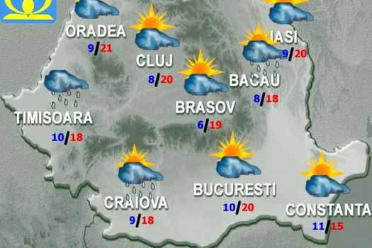 Vremea va fi în general instabilă. Cerul va avea înnorări temporar accentuate şi îndeosebi în regiunile din jumătatea sudică a ţării vor fi averse şi descărcări electrice. Izolat cantităţile de apă vor depăşi 20…25 l/mp şi vor fi căderi de grindină. În zona montană înaltă, precipitaţiile vor fi şi sub formă de lapoviţă şi trecător, ninsoare. Vântul va sufla moderat, cu intensificări îndeosebi în sud-est şi pe crestele montane. Temperaturile maxime, în scădere în majoritatea zonelor, se vor încadra între 10 şi 20 de grade, iar cele minime vor fi cuprinse între 4 şi 11 grade.
