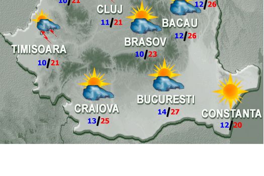 Cerul va prezenta înnorări temporar accentuate şi vor fi averse şi descărcări electrice, ziua în Banat, Crişana, Maramureş şi local în zonele de deal şi de munte, iar noaptea, pe arii extinse, îndeosebi în Oltenia, vestul Munteniei şi în Transilvania. Ploile vor avea şi caracter torenţial, astfel încât, pe arii restrânse cantităţile de apă vor depăşi 25 l/mp şi vor fi condiţii de grindină. În restul teritoriului cerul va fi variabil, iar astfel de fenomene vor fi posibile izolat, îndeosebi după-amiază. Vântul va sufla slab şi moderat, cu intensificări în timpul ploilor, chiar cu aspect de vijelie. Temperatura va marca o scădere în regiunile vestice, dar în rest vremea va fi caldă pentru această dată şi vor fi maxime de la 18…20 de grade în Dealurile de Vest şi pe litoral, până la 28…29 de grade în Lunca Dunării şi minime cuprinse între 7 şi 15 grade.