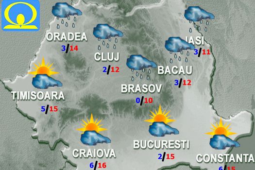 Valorile termice se vor menţine uşor sub mediile climatologice specifice acestei date. Temperatura maximă se va situa în jurul valorii de 15 grade, iar cea minimă va fi de 2…4 grade. Cerul va fi variabil, cu înnorări mai ales spre seară şi în prima parte a nopţii, când, trecător, va ploua slab. Vântul va avea unele intensificări în cursul zilei.