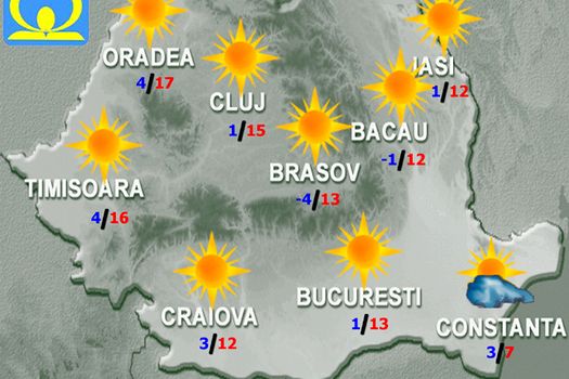 Astfel, temperaturile maxime se vor încadra între 6…7 grade pe litoral şi 17…18 grade în regiunile vestice. Cerul va fi variabil la senin, cu unele înnorări noaptea în vestul teritoriului. Vântul va sufla slab şi moderat, cu unele intensificări în Banat, în Moldova şi la munte. Se va semnala ceaţă, izolat în primele ore ale dimineţii şi cu caracter local noaptea şi izolat se va produce brumă. Minimele termice vor fi cuprinse între -2 şi 6 grade, mai scăzute în depresiunile Carpaţilor Orientali, spre -6 grade, dar şi uşor mai ridicate în Dealurile Banatului.