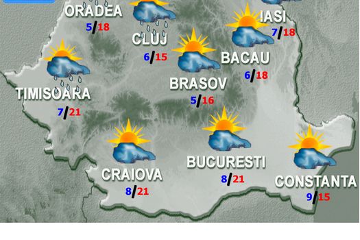 Valorile termice vor fi apropiate de mediile climatologice specifice perioadei, exceptând regiunile sudice şi sud-estice, unde vor fi mai ridicate decât acestea. Cerul va fi variabil, cu înnorări temporare după-amiaza şi noaptea când pe arii restrânse în nordul, centrul şi nord-estul ţării vor fi ploi de scurtă durată, posibil însoţite de descărcări electrice. În nordul Carpaţilor Orientali, mai ales la altitudini mari, vor fi şi precipitaţii slabe sub formă de lapoviţă şi ninsoare. Vântul va sufla slab şi moderat, temporar şi local cu intensificări în majoritatea regiunilor, dar mai ales în zona montană înaltă. Temperaturile maxime se vor încadra între 12 şi 22 de grade, iar cele minime între 1 şi 10 grade, mai coborâte în depresiuni. Pe arii restrânse, noaptea, în Transilvania şi Maramureş, se va produce brumă.