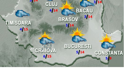 Vremea se va mentine caldă pentru această perioadă, desi valorile termice vor marca o scădere fată de ziua precedentă, in cea mai mare parte a tării. Cerul va fi temporar noros. Va ploua, in prima parte a intervalului, in regiunile vestice, nord-vestice si izolat in cele sudice si centrale, iar noaptea pe arii relativ extinse in nord-vest, centru, sud-est si pe arii restranse in rest. Ploile vor fi si sub formă de aversă. La munte, mai ales la altitudini mari, se vor semnala si precipitatii sub formă de lapovită si ninsoare. Vantul va sufla slab si moderat, cu unele intensificări ziua, in Muntenia si Dobrogea. Temperaturile maxime se vor incadra intre 8 si 18 grade, iar cele minime se vor situa intre 0 si 7 grade. Dimineata si noaptea, izolat, se va semnala ceaţă.