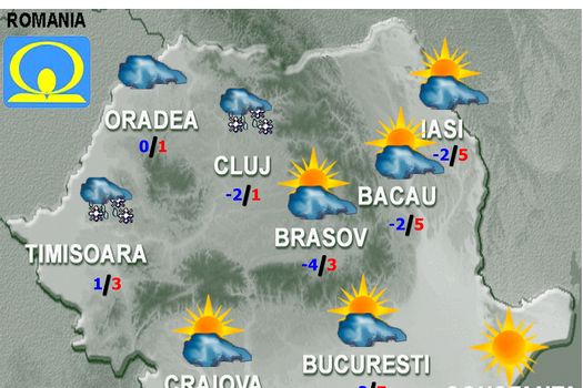 Temperaturile maxime vor fi cuprinse între 2 grade în Transilvania şi 12…13 grade în sudul Banatului şi Oltenia, iar cele minime se vor încadra între -5 grade în depresiunile Carpaţilor Orientali şi 6…7 grade în Dealurile de Vest şi pe litoral.