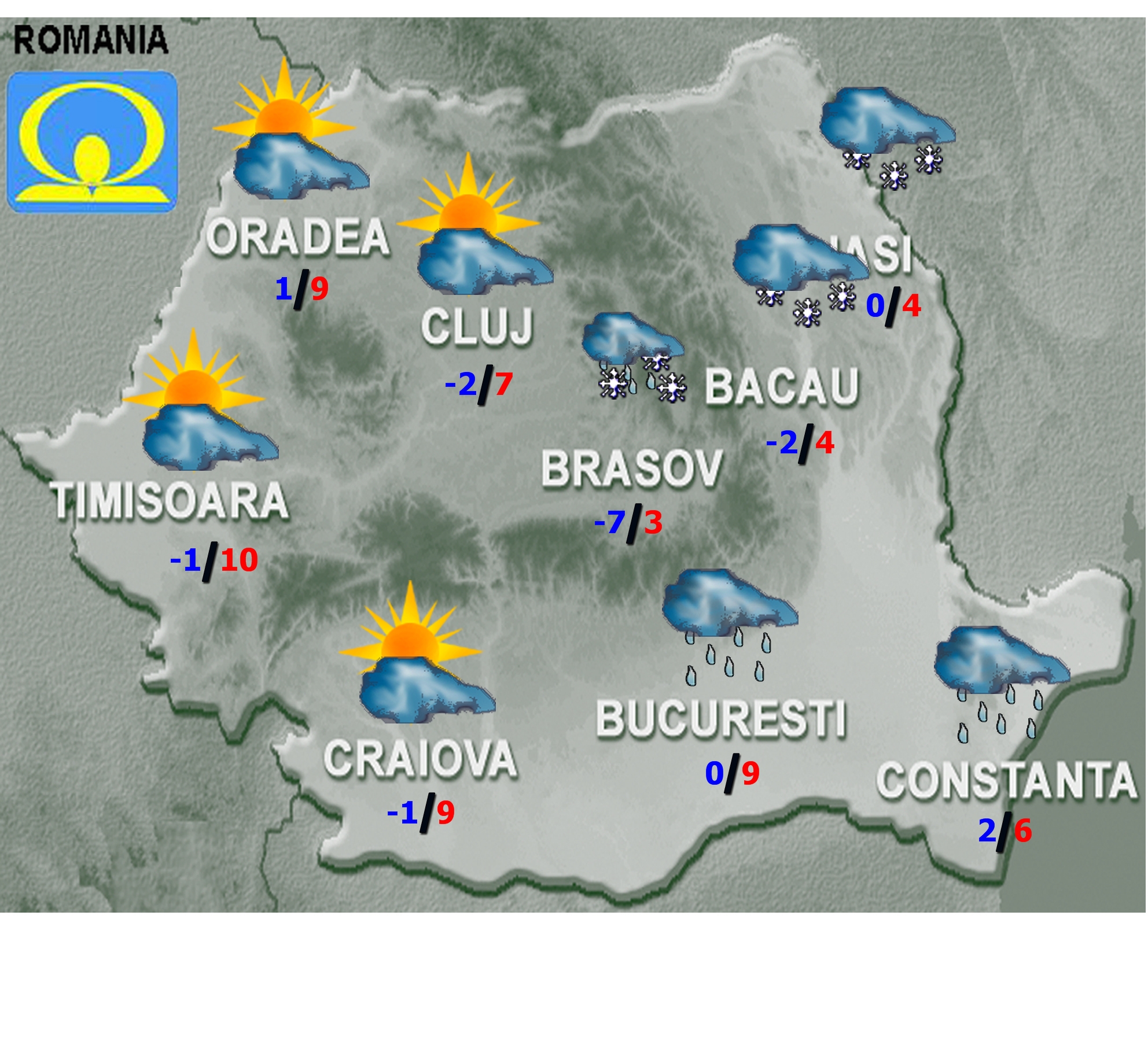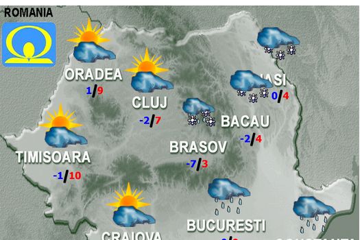 Noaptea, astfel de manifestări vor fi, pe arii restrânse, în nord-vest, nord şi centru; în primele ore şi în extremitatea de răsărit, iar în restul teritoriului, cerul va deveni variabil. Precipitaţiile vor fi mai ales sub formă de ninsoare în Moldova şi la munte; mixte în Transilvania; predominant ploi în Bărăgan şi în Dobrogea şi doar ploi în celelalte zone. Vântul va sufla în general moderat, iar în est, sud-est şi la munte va avea intensificări, îndeosebi în prima parte a intervalului. Temperaturile maxime se vor încadra între 1 şi 12 grade, iar cele minime între -6 şi 2 grade, mai scăzute în depresiuni, spre -8…-10 grade. Local, se va produce brumă şi izolat îngheţ la sol.