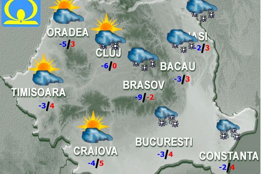 În celelalte regiuni înnorările vor fi temporare, iar precipitaţiile, predominant sub formă de ninsoare, se vor semnala pe arii mai restrânse. Vântul va continua să prezinte intensificări la munte, unde va fi viscol, dar local şi în zonele mai joase de relief, astfel încât ninsoarea va fi spulberată. Temperaturile maxime se vor încadra între -3…-2 grade în depresiuni şi 5…6 grade în sud şi sud-vest, iar cele minime vor fi cuprinse, în general, între -12 şi -2 grade.