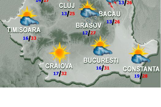 În sud şi în sud-vest, va fi o vreme călduroasă, iar fenomene asociate instabilităţii atmosferice se vor semnala pe arii restrânse după-amiaza şi cu caracter local seara şi la începutul nopţii, cu precădere în Dobrogea şi jumătatea de est a Munteniei. Izolat va cădea grindină, iar cantităţile de apă vor depăşi 20…25 l/mp. Vântul va sufla moderat, cu intensificări locale, în special asociat averselor. Temperaturile maxime se vor încadra între 22…23 de grade în extremitatea de nord a ţării şi 33…34 de grade în cea de sud-vest; minimele vor fi cuprinse între 9 şi 19 grade.
