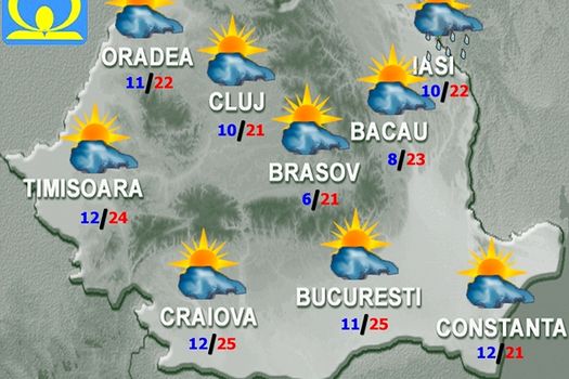 Regimul termic va continua să crească, aşa încât, vremea va deveni mai caldă decât în mod obişnuit în această perioadă. În cursul zilei cerul va fi variabil, cu înnorări trecătoare, dar numai izolat vor fi ploi slabe de scurtă durată, după amiază în regiunile nord-estice, iar spre seară în cele vestice şi de nord-vest. Noaptea, înnorările se vor accentua şi va ploua în interiorul arcului carpatic şi la munte, unde aversele vor fi însoţite de descărcări electrice. Vântul va sufla slab şi moderat, cu unele intensificări îndeosebi la munte.