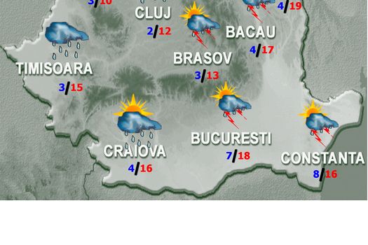 Cerul va avea înnorări temporar accentuate. Vor fi ploi, mai ales averse, însoţite de descărcări electrice şi pe arii restrânse vor fi condiţii de grindină. La munte, treptat, vor predomina ninsorile, iar noaptea, în Transilvania, se vor semnala precipitaţii mixte. Local cantităţile de apă vor depăşi 15…20 l/mp. Vântul va sufla moderat, cu intensificări temporare în toate zonele, viteze mai mari urmând a se înregistra în sud-vestul ţării şi la munte. Temperaturile maxime se vor încadra între 9 şi 19 grade, iar cele minime între 0 şi 9 grade. Noaptea vor fi condiţii de brumă, în nord-vestul şi centrul teritoriului.