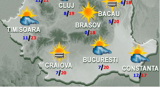 Valorile termice vor fi în creştere în toată ţara, totuşi vremea va fi încă rece în primele ore ale zilei în majoritatea zonelor. În jumătatea de nord-vest, cerul va avea înnorări trecătoare ziua, dar mai accentuate pe timpul nopţii când va ploua. Vor fi mai ales averse, posibil însoţite izolat de descărcări electrice, iar pe spaţii mici în zona Munţilor Apuseni, în nordul Carpaţilor Orientali şi în Maramureş cantităţile de apă vor depăşi 10…15 l/mp. În restul teritoriului, cerul va fi variabil şi se va semnala ceaţă, izolat în orele dimineţii şi cu caracter local în a doua parte a nopţii. Vântul va sufla slab şi moderat, cu unele intensificări la munte, în Moldova, Banat şi Crişana, iar în vest-nord-vest, de scurtă durată şi asociat ploilor, noaptea. Temperaturile maxime se vor încadra între 15 şi 24 de grade, iar cele minime între 3 şi 13 grade, mai scăzute, spre -4 grade, în estul Transilvaniei unde se va produce brumă.