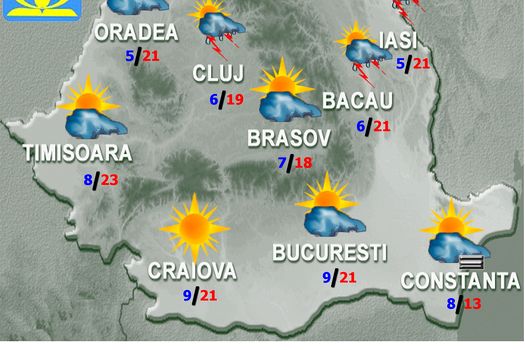 Astfel, temperaturile maxime se vor încadra între 16 şi 24 grade, mai scăzute în estul Dobrogei. Cerul va fi variabil, cu înnorări temporar accentuate în nordul, centrul şi estul ţării, precum şi la munte, unde local vor fi averse şi se vor semnala descărcări electrice. Mai ales în a doua parte a intervalului, în nord-est vor fi condiţii pentru grindină sau măzăriche. Pe crestele Carpaţilor Orientali, în cursul nopţii, precipitaţiile vor fi sub formă de lapoviţă şi ninsoare. Cantităţile de apă vor depăşi pe arii restrânse 15 l/mp. Vântul va sufla slab şi moderat, cu intensificări locale, cu viteze mai mari noaptea în est şi în sud. Minimele termice vor fi cuprinse între 1 şi 11 grade. În orele dimineţii, în Dobrogea izolat ceaţa va persista.