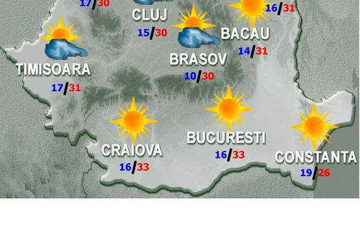 Vremea va fi călduroasă în cea mai mare parte a ţării, iar temperaturile maxime se vor încadra între 25 şi 35 de grade, cu cele mai ridicate valori în Lunca Dunării şi cele mai scăzute în nordul litoralului. În vestul, nordul şi centrul ţării cerul se va înnora treptat, iar în a doua parte a zilei şi noaptea vor fi averse, descărcări electrice şi condiţii de grindină. Izolat cantităţile de apă vor depăşi 20 l/mp. În restul teritoriului cerul va fi variabil la senin. Vântul va sufla slab şi moderat, cu intensificări locale, în special în vestul ţării şi la munte. Temperaturile minime, în scădere accentuată în regiunile vestice, vor fi cuprinse, în general, între 10 şi 20 de grade.