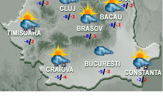 Vremea va fi rece în cea mai mare parte a ţării, geroasă dimineaţa şi noaptea local în nord şi centru. Cerul va fi variabil în nord-vestul teritoriului, iar în rest înnorările vor persista. În regiunile sudice şi sud-estice, temporar va ninge, iar vântul va continua să prezinte intensificări, cu viteze mai mari în Dobrogea, jumătatea estică a Munteniei, în sudul Moldovei şi al Banatului, viscolind sau spulberând zăpada. În celelalte regiuni, ninsorile vor fi posibile izolat, iar vântul va sufla slab şi moderat, cu unele intensificări în zona de munte. Temperaturile maxime se vor încadra între -7 şi 3 grade, iar cele minime în general între -14 şi -4 grade. În zonele joase de relief din vest şi centru, îndeosebi în a doua parte a intervalului, vor fi condiţii de ceaţă.