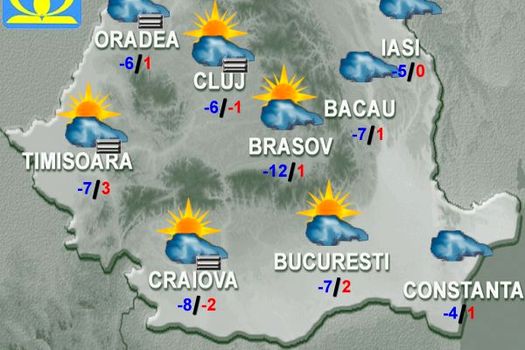 Valorile termice vor rămâne sub mediile climatologice specifice perioadei. Cerul va avea înnorări, mai ales dimineaţa şi noaptea, când vor fi condiţii de ceaţă, asociată cu chiciură. Vântul va sufla în general slab. Temperatura maximă va fi de 1…2 grade, iar cea minimă de -9…-7 grade.