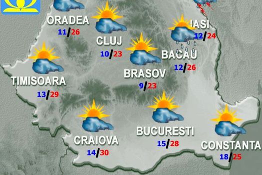 Vremea se va menţine în general frumoasă. Cerul va fi variabil, cu unele înnorări în regiunile sud-estice, precum şi în zonele de deal şi de munte, dar numai pe arii restrânse vor fi averse şi descărcări electrice. Vântul va sufla slab şi moderat, cu unele intensificări pe crestele montane. Temperaturile maxime se vor încadra între 21 de grade în nordul şi în centrul teritoriului şi 31 de grade în sudul Olteniei, iar cele minime între 7 şi 17 grade, mai scăzute în depresiunile intramontane, spre 4 grade.